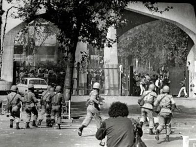 ناگهان یک کپسول گاز اشکآور که در هوا میچرخید، روی زمین چمن دانشگاه فرود آمد. عدهای سراسیمه به سوی در ورودی دانشگاه دویدند، ولی در همین موقع صدای تیراندازی بلند شد. سربازان از پشت میلههای دانشگاه به سوی مردم بیدفاع و حقطلب شلیک میکردند. هنوز فریادهای نترسید، تیراندازی هوایی است بلند بود که دانشجویی به زمین در غلطید. از این لحظه به بعد دانشگاه و خیابانهای اطراف آن مبدل به صحنه جنگ و گریز شد.